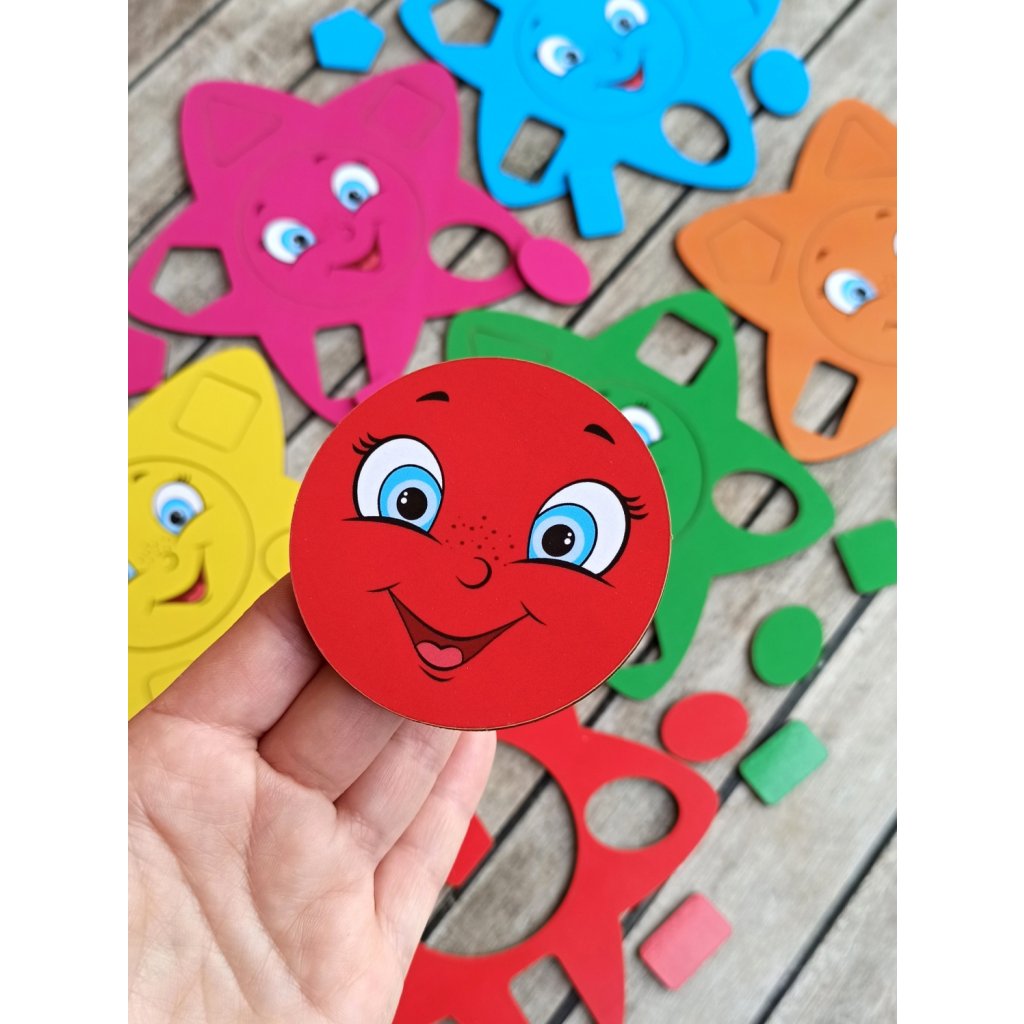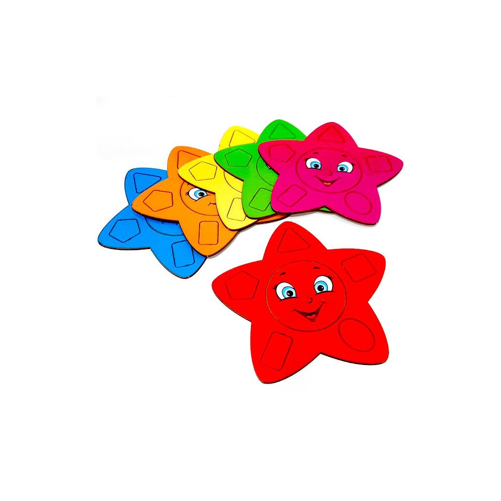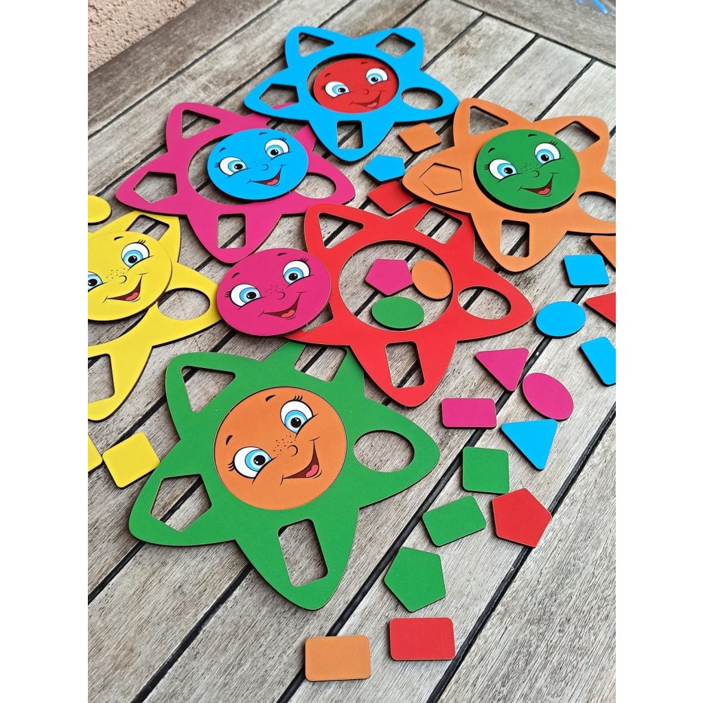 Kam patří modrý čtvereček? A kam žlutý trojúhelníček? Dáš zelenému sluníčku růžové kolečko? Mnoho dílků (42 ks), 5 různých tvarů v 6-ti barvách. Zábava na dlouho, skvělé také k procvičení motoriky prstíků, doporučujeme. Děti skládají hvězdičky podle barev, své fantazie, nebo sluchových pokynů. Dílky využijete i k různým dalším hrám, třídění... Vhodné i pro větší kolektiv, do školek, dětských skupinek...
