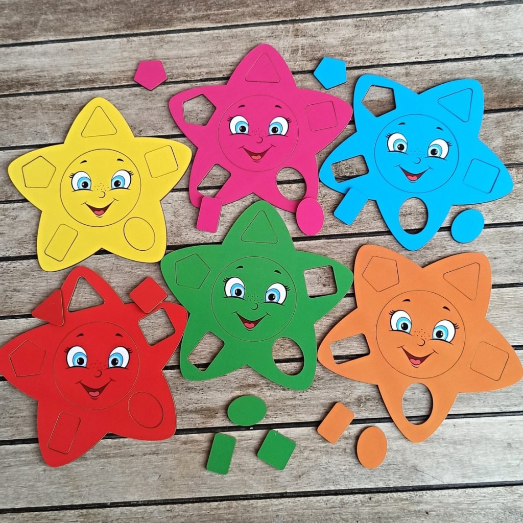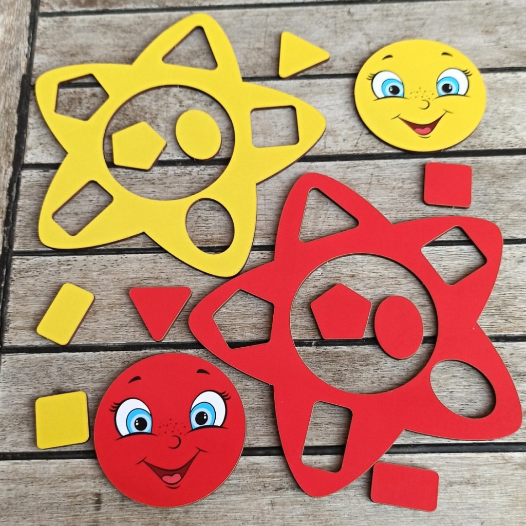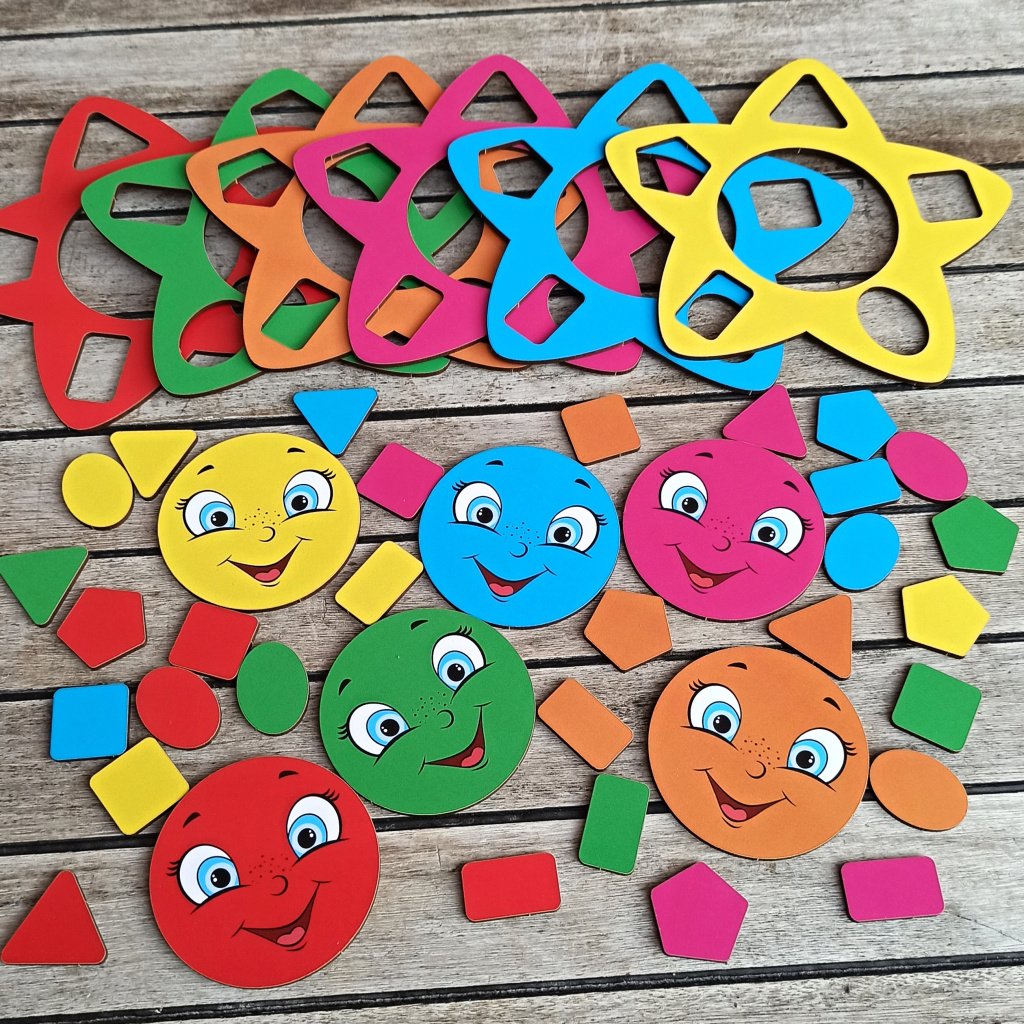 Kam patří modrý čtvereček? A kam žlutý trojúhelníček? Dáš zelenému sluníčku růžové kolečko? Mnoho dílků (42 ks), 5 různých tvarů v 6-ti barvách. Zábava na dlouho, skvělé také k procvičení motoriky prstíků, doporučujeme. Děti skládají hvězdičky podle barev, své fantazie, nebo sluchových pokynů. Dílky využijete i k různým dalším hrám, třídění... Vhodné i pro větší kolektiv, do školek, dětských skupinek...