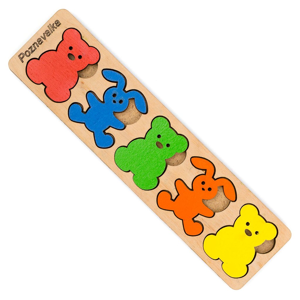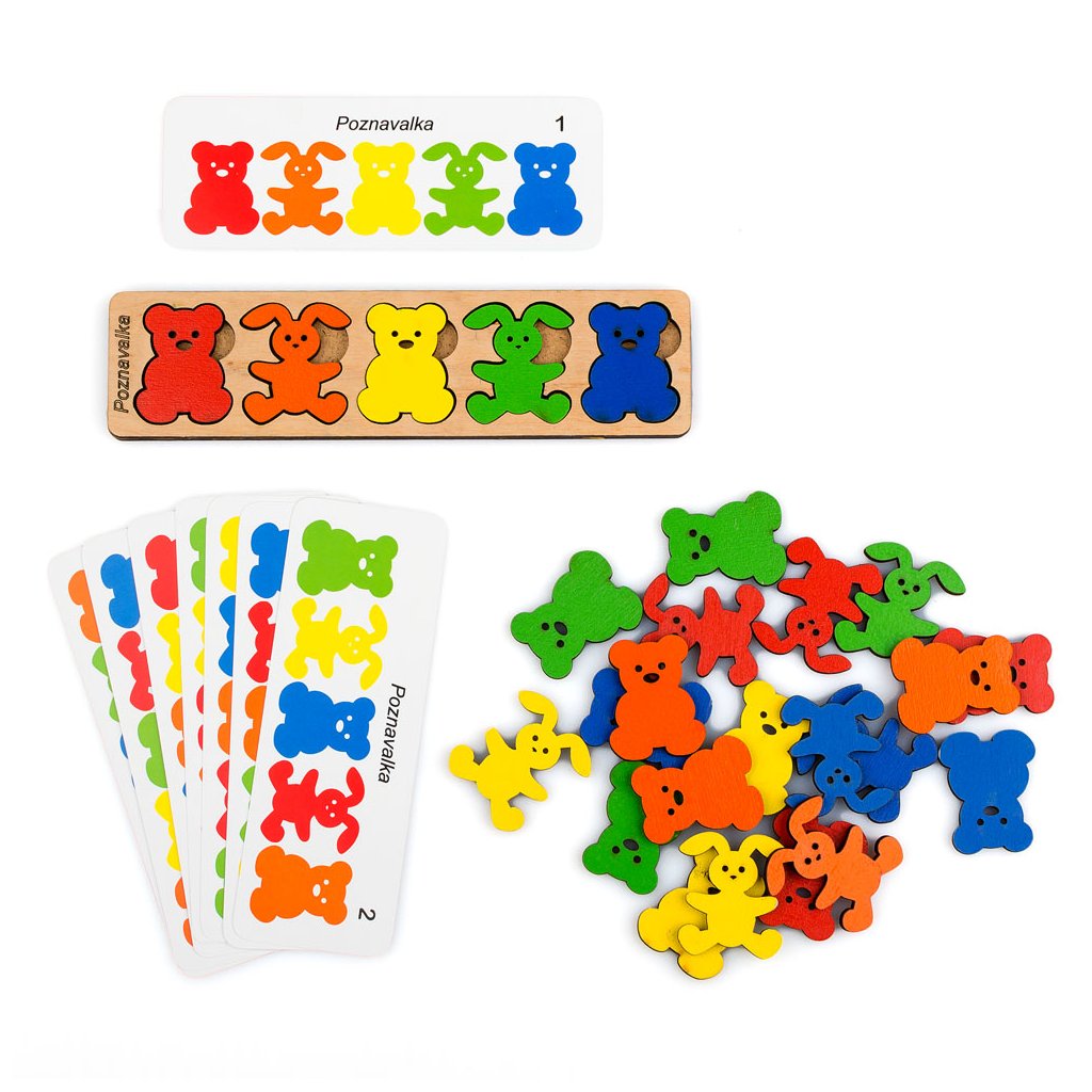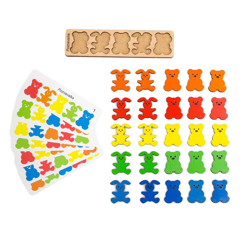 Roztomilá didaktická dřevěná hra - vkládačka s barevnýmI zajíčky a medvídky (25 ks, 5 barev) + předlohy na kartičkách. Široké využití dílků k dalším aktivitám! Procvičí rozpoznávání barev, jemnou motoriku, zrakové vnímání, koordinaci oko-ruka, podporuje soustředění. Můžete skládat dle fantazie, předloh na přiložených kartičkách, sluchových pokynů, skládat logické řady, třídit podle barev, počítat. K volnému hraní i dalším vlastním aktivitám. Velká variabilita využití, děti budou nadšené - doporučujeme!