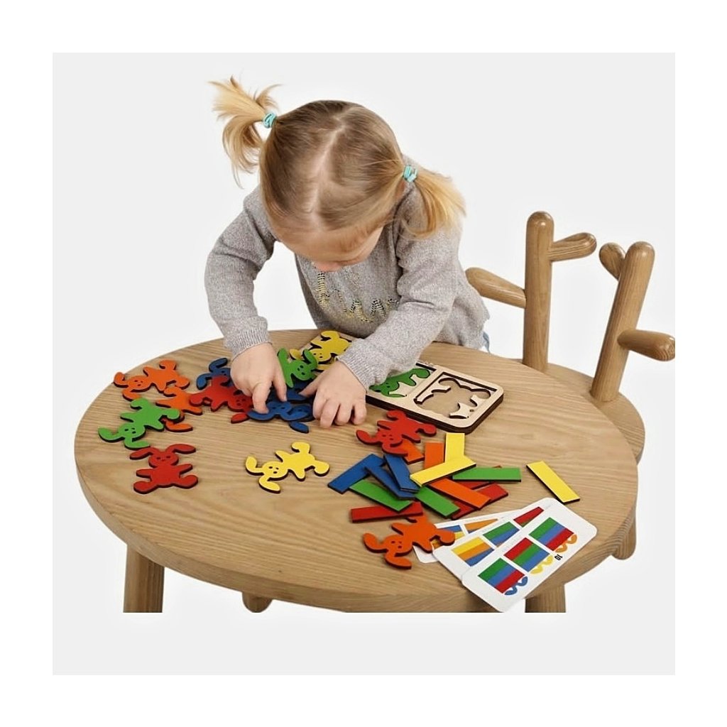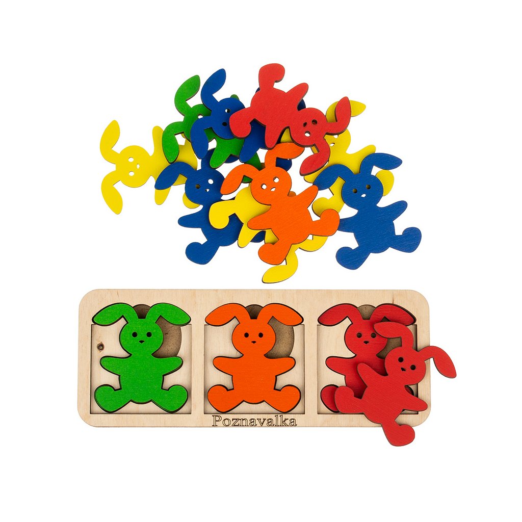 Kdo uloží zajíčky do postýlek? Robustnější logická skládačka 15 zajíčků 7,5 cm (5 barev x 3 ks), 15 dílků peřinky + předlohy na kartičkách. Široké využití, velké dílky, děti si se zajíčky budou rády hrát! Procvičí rozpoznávání barev, jemnou motoriku, zrakové vnímání, koordinaci oko-ruka, podporuje soustředění. Můžete skládat dle fantazie, předloh na přiložených kartičkách, sluchových pokynů, skládat logické řady, třídit podle barev... Krásný dárek.