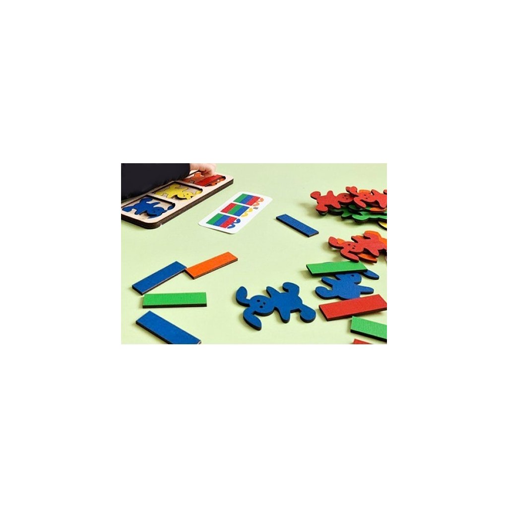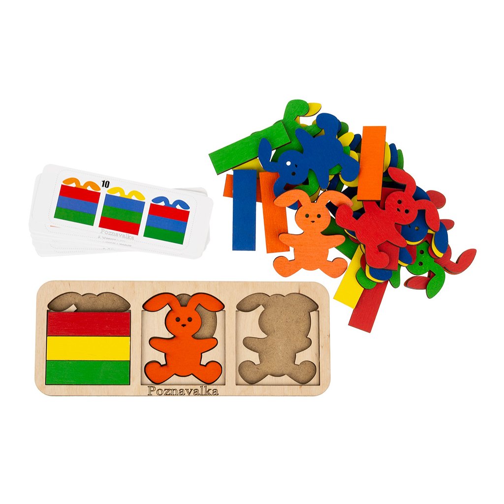 Obsahuje: 1 ks podložka, 15 ks oboustranných barevných figurek zajíčků (5 barev x 3 ks), 15 ks dílků peřinek (5 barev x 3 ks), 14 kartiček s předlohami