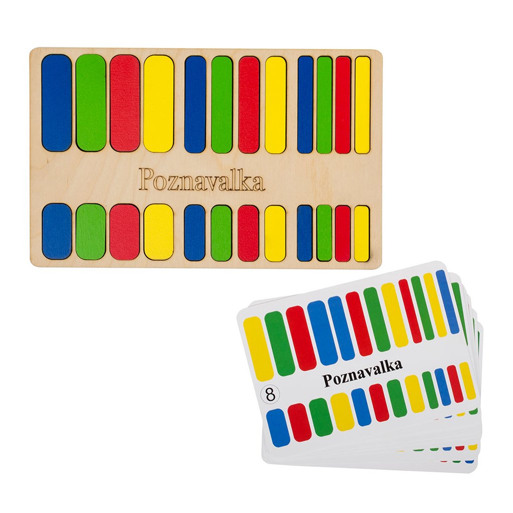 Obsahuje: podložka, 24 barevných tyčinek (4 barvy x 2 délky x 3 šířky), 16 předloh (8 oboustranných karet)