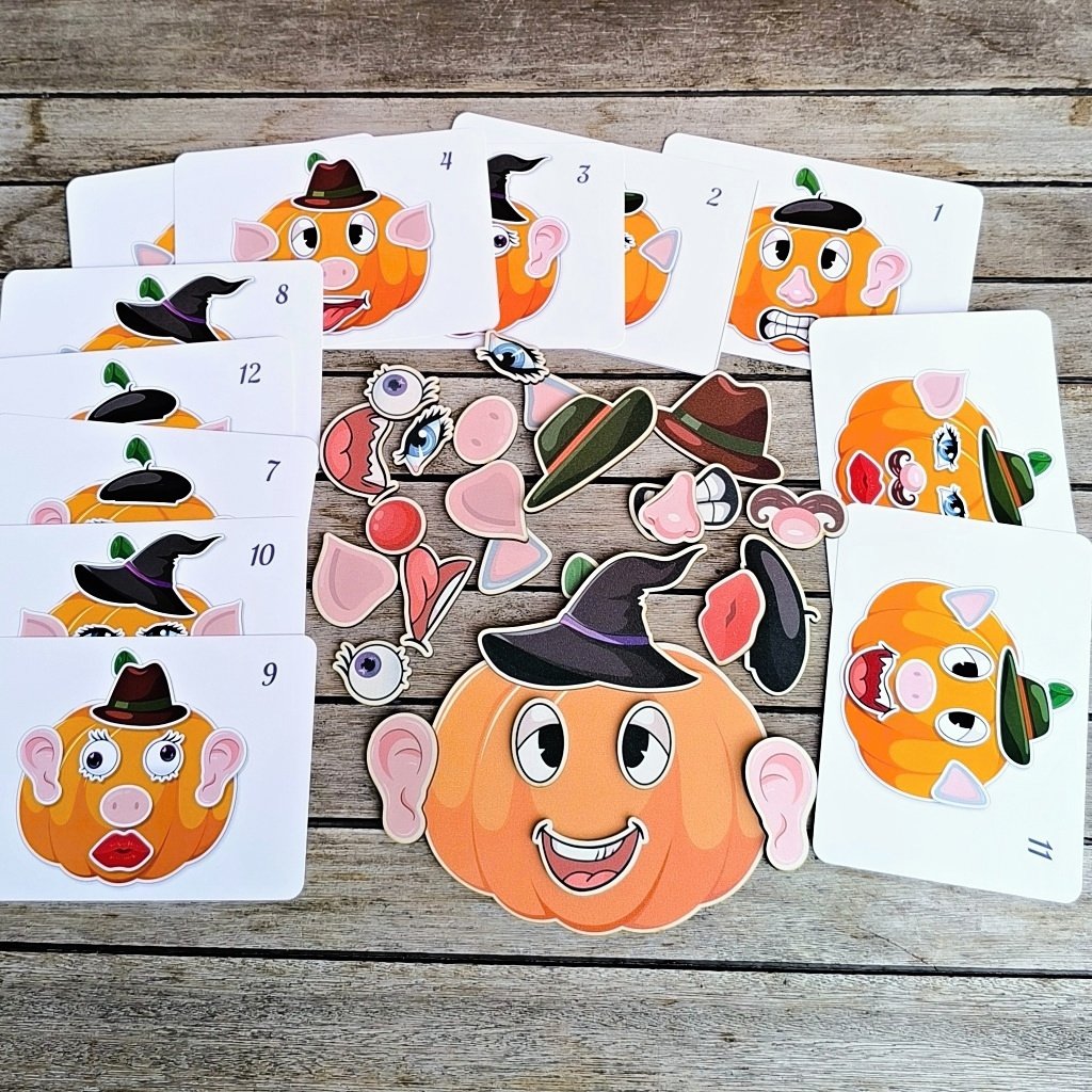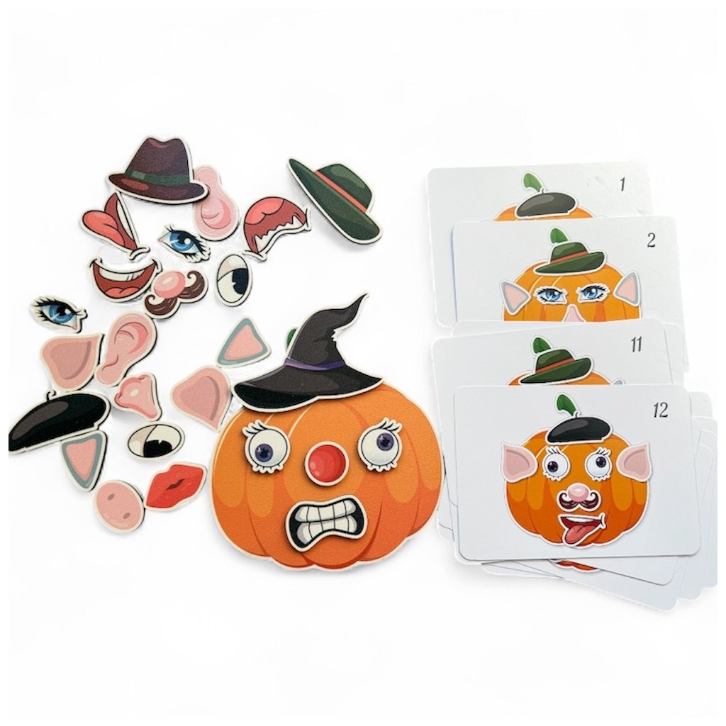Poskládej si různé veselé obličeje podle předloh, nebo fantazie! Podložka-dýně, 24 různých dílků (oči, uši, nosy, pusy, klobouky) a 12 kartiček s předlohami. Bude tvá dýňová příšerka srandovní, nebo strašidelná? Podložka-dýně cca 14,5 cm. Využijete i na podzimní tématické hrátky.