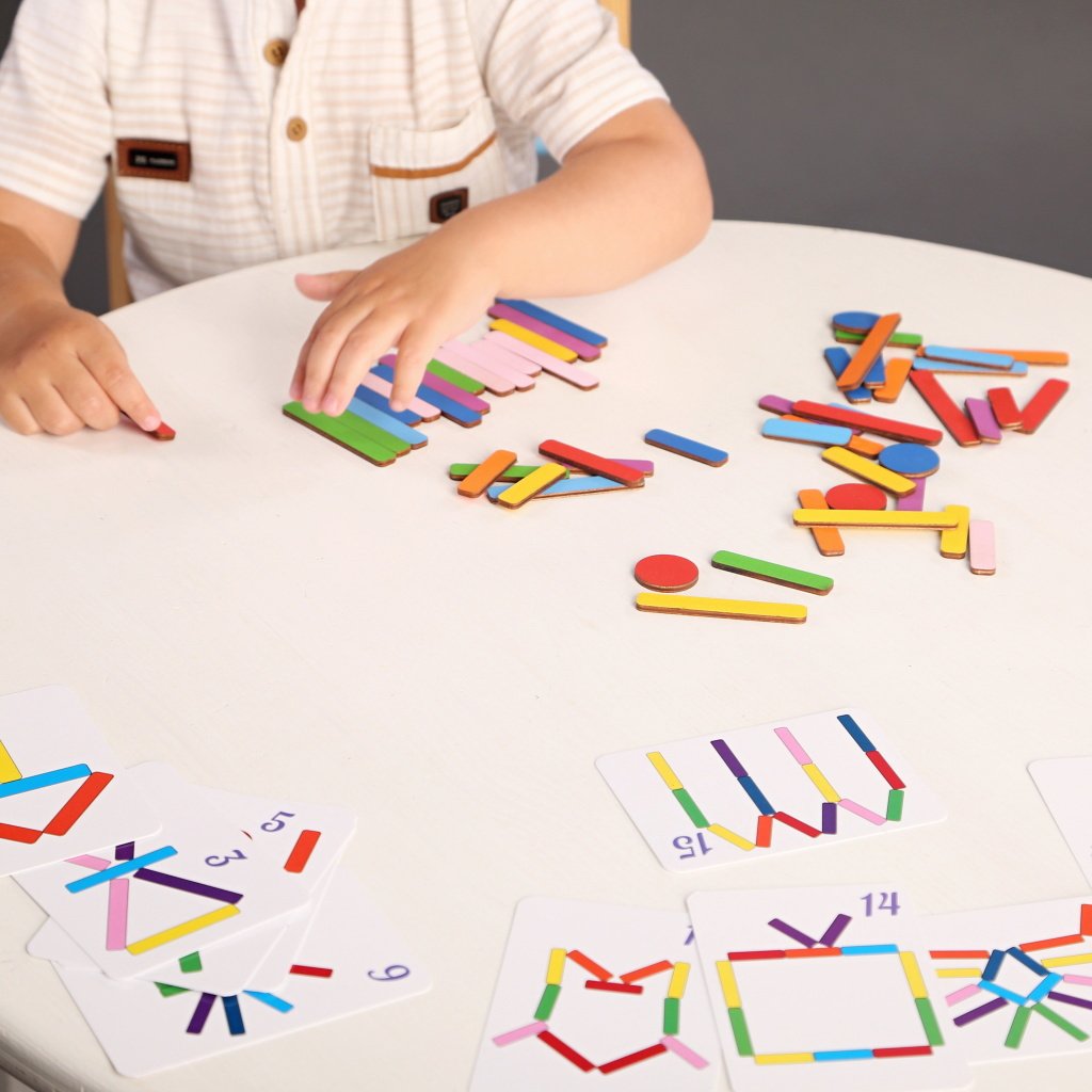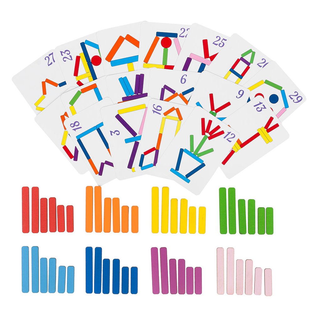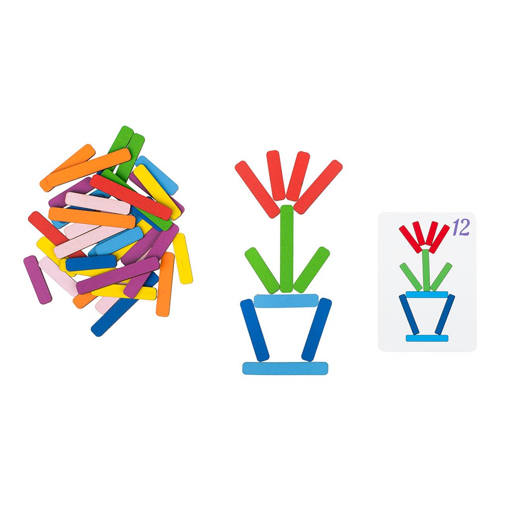 Dřevěná tyčinková mozaika - skládačka včetně předloh. Celkem 52 dílků (48 tyčinek 3 rozměrů v 8 barvách + 4 kolečka 2 barev), 34 zadání na kartičkách. Třídění dle 2 parametrů (velikost-barva), rozpoznávání barev, porovnávání velikostí, jemná motorika, zrakové vnímání, koordinace oko-ruka, práce se zadáním - skládání dle předloh, prostorová orientace. Podporuje soustředění a rozvoj fantazie. Poskládejte různé geometrické útvary, obrázky dle předloh, nebo vlastní představivosti, třiďte, počítejte, zadávejte sluchové pokyny. Dílky také můžete využít na další aktivity, třeba jako materiál ke vhazování do našich třídícíh boxíků, na volné hraní...