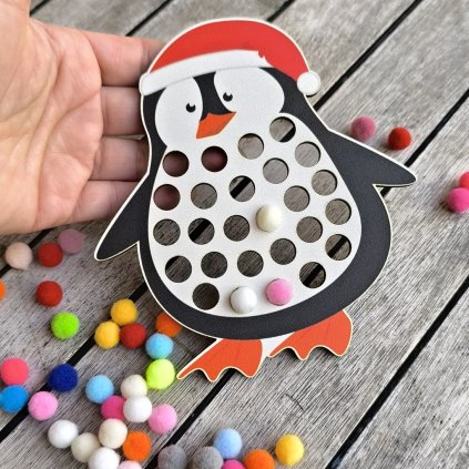 Hra dřevěná destička s bambulkami pompony provlékání Tučňák 2