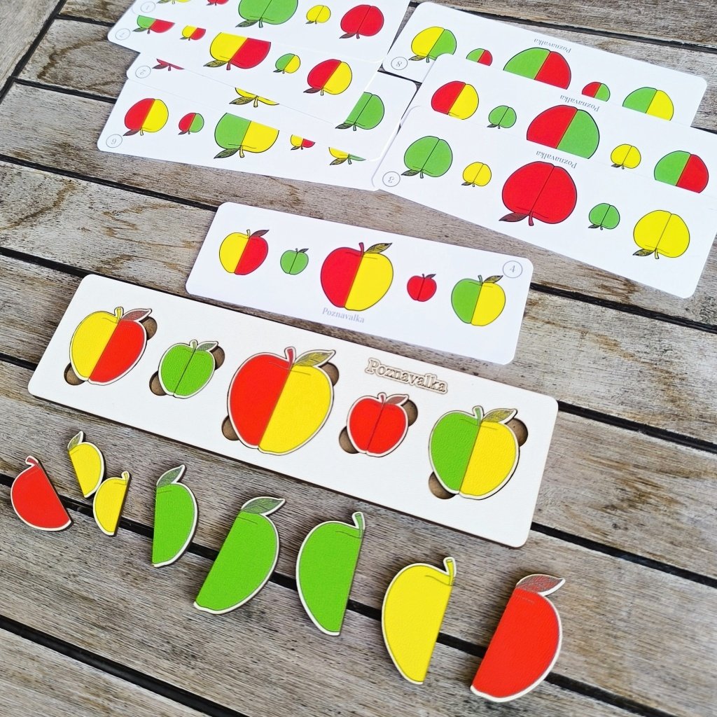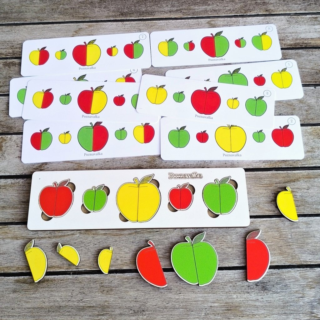 Zajímavá jablíčková hra - vkládačka s předlohami barevná jablka polovinky. Jablíčka (3 barvy x 3 velikosti) můžete skládat, třídit podle velikosti, nebo barvy, vkládat do podložky dle předloh, či fantazie. Procvičte zrakové vnímání i jemnou motoriku, chytré hraní s podzimní tématikou!