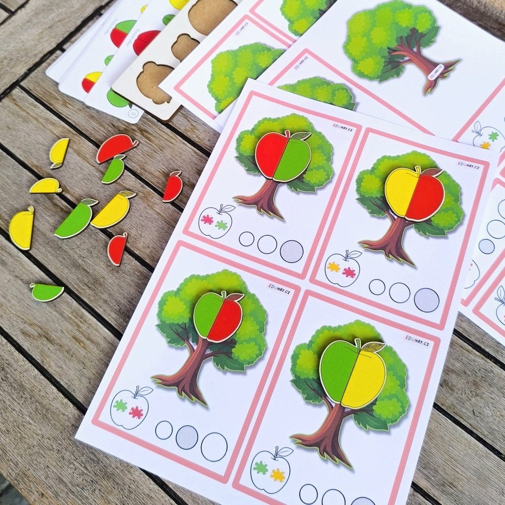 Obsahuje: 1 podložka, 9 jablíček/18 polovin (3 barvy x 3 velikosti), 8 karet s předlohami
