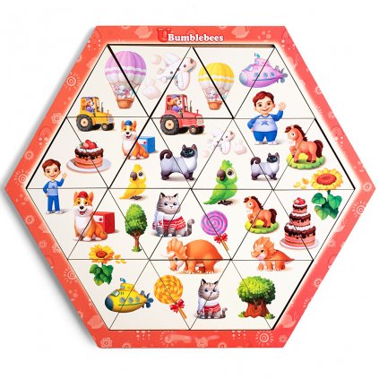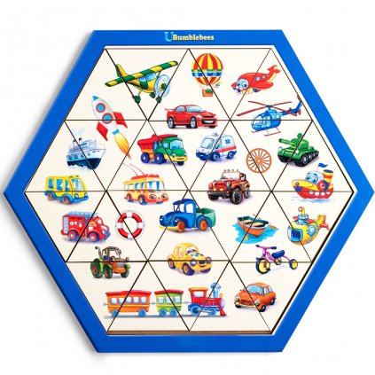Zajímavá těžší skládačka z trojúhelníkových dílků (tri-puzzle), s motivem ovoce v páru CELEK + ŘEZ na šestiúhelníkové desce. Celkem 24 dílků, které je potřeba poskládat do desky, aby všechny pasovaly. Vhodné pro starší děti, není to tak jednoduché... :-) Doporučujeme vyfotit, nebo stáhnout obrázek, ať máte v případě potřeby k dispozici nápovědu. Vhodné pro roztočení mozkových závitů starších předškoláčků/školáčků. Skládání procvičuje zrakové vnímání, prostorovou představivost, soustředění, logiku, koordinaci oko-ruka. Můžete dítěti ukázat, co je „část a celek“, případně motivy spočítat, pojmenovávat je...