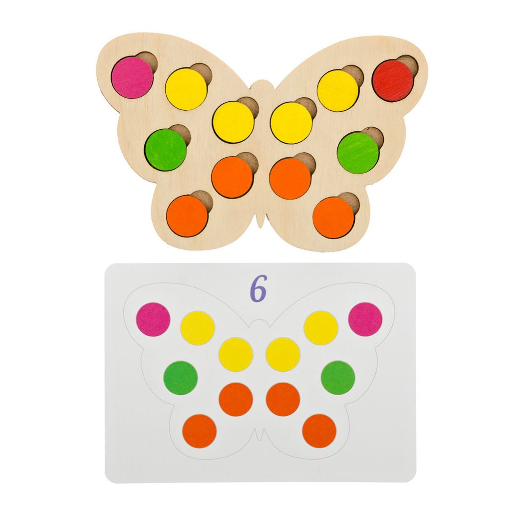 Rozvíjející víceúčelová hra-vkládačka motýlek s hromadou větších barevných koleček (70 ks) a předlohami. Procvičí barvičky, jemnou motoriku, zrakové vnímání, koordinaci oko-ruka, podporuje soustředění, fantazii... Krásná sada s širokým využitím - skládání dle fantazie, skládání dle předloh na přiložených kartičkách, třídění koleček (7 barev x 10 ks), skládání obrazců, počítání... V provedení větší rozměr koleček a menší množství otvorů ke vkládání než jiné sady - vhodné pro mladší děti a děti se zhoršenou motorikou.