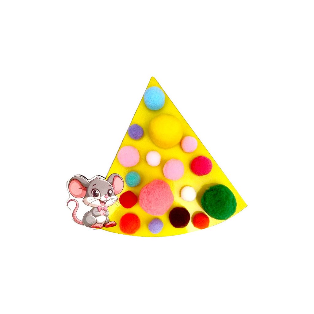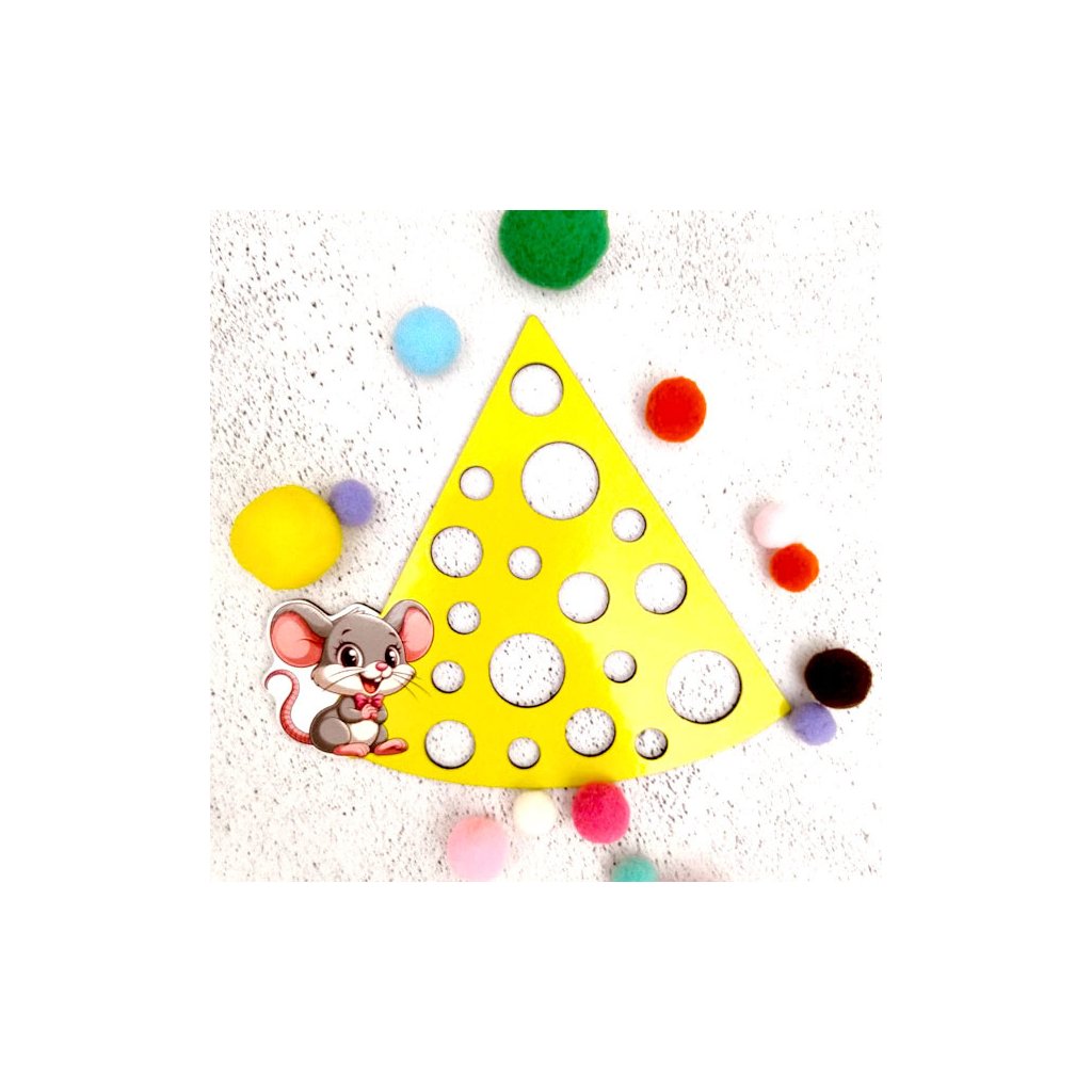 Motorická hra destička Myška se sýrem s otvory a bambulkami ve třech rozměrech - malý, střední, velký. Děti mohou porovnávat, upevní pojmy malý-střední-velký, skládáním bambulek na desku ve správné velikosti procvičí motoriku prstíků a zrakové vnímání. Destičku můžete třeba i provlékat tkaničkou. Sada včetně bambulek (mix barev a velikostí).