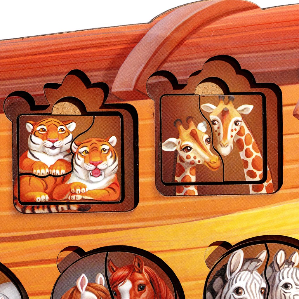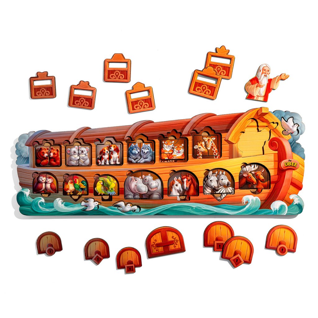 Velké dvouvrstvé puzzle (48 cm) s vánočním křesťanským motivem Noemovy archy. Skládání ve dvou vrstvách, spousta dílků. Identifikace zvířátek, vyprávění známého příběhu. Puzzle procvičí jemnou motoriku, prostorovou orientaci, soustředění, zrakové vnímání, koordinaci oko-ruka. Všechny zvířátka jsou dvakrát, dítě je může skládát také mimo podložku jako klasické puzzle-polovinky (každý dvojice má jinak tvarovaný spoj).