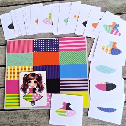 Variabilní dřevěná hra - sada vkládaček Slepičky s barevnými vajíčky. Obsahuje 6 slepiček, 30 vajíček (vajíčka 6 barev v 5-ti velikostech)....