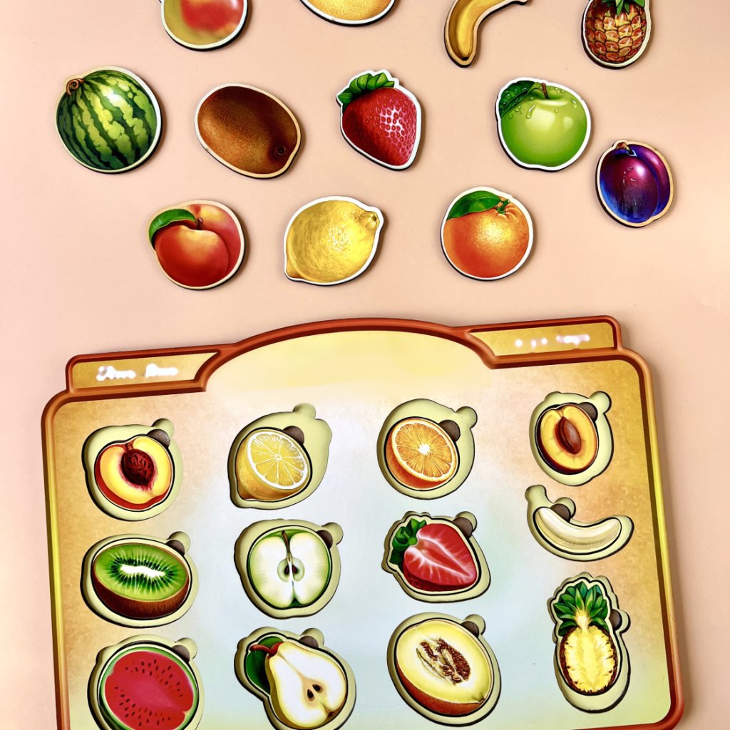 Netradiční naučná vkládačka s motivem ovoce a půlek. Celkem 12 druhů ovoce (banán, hruška, jablko, pomeranč...). Děti je nejprve identifikují a vkládají do vkládačky podle obrysů, nebo třeba ovoce třídí mimo podložku, co k sobě patří (celek + řez). K povídání, skládání, hraní, třídění... Vhodné jako doplněk k výukovému modulu "Ovoce" ve školkách, domácímu učení, v montessori skupinách.