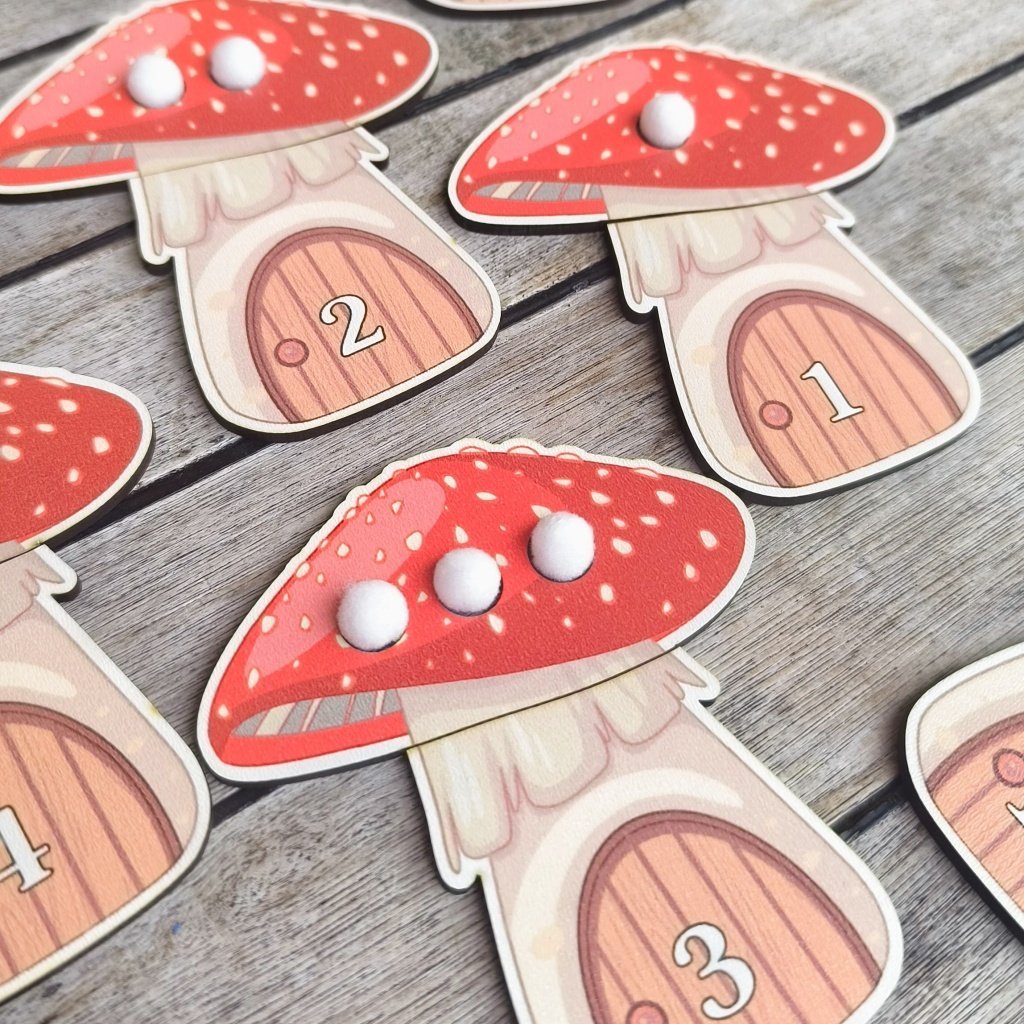 Originální pomůcka pro první počítání a motoriku v jednom - skládací sada Muchomůrky domečky s bambulkami (pomponky 1 cm, cca 100 ks). Zapojení vizuomotoriky a hmatové stimulace. Každá muchomůrka se skládá ze dvou částí - spodní části s číslem a vrchní části s příslušným počtem otvorů. Děti poloviny správně přiřazují, počítají za pomoci prstíků v otvorech i skládáním bambulek do otvorů. Velikost celé muchomůrky 10 cm. Vhodná sada i pro větší kolektivy. Trénování jemné motoriky a fixace prvních čísel do 10 s hmatovým prožitkem hravou formou, která se bude dětem líbit! Kvalitní bambulky příjemné na dotek, mix barev červená+bílá. Krásná sada třeba k podzimním aktivitám, možné využití i v suchém sensory...