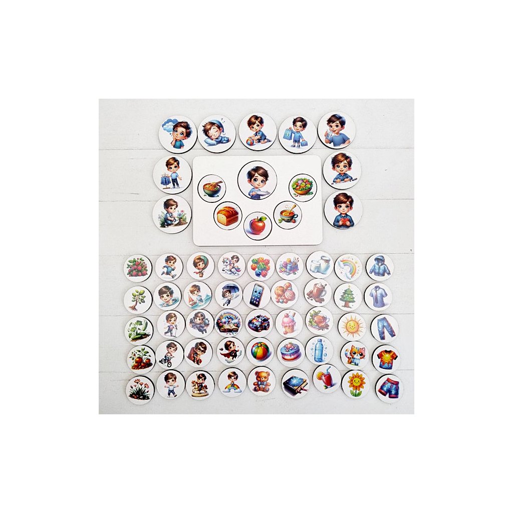 Pomůcka POVÍDACÍ SADA KLUK - první dějeslova (slovesa), skládání vět, povídání. Podložka + 50 dílků (10 s postavou chlapečka při nějaké činnosti + 40 ostatních dílků). Co pije kluk? O čem se mu zdá? Co maluje, co si obleče? Podpůrná hra pro rozmluvení, dílky využijete i na další vlastní aktivity (např. třídění dle kategorií). Můžete dětem dopředu nachystat dílky do podložky, nebo je nechat sestavovat za pomocí dílků vlastní příběhy (včetně bláznivých).
