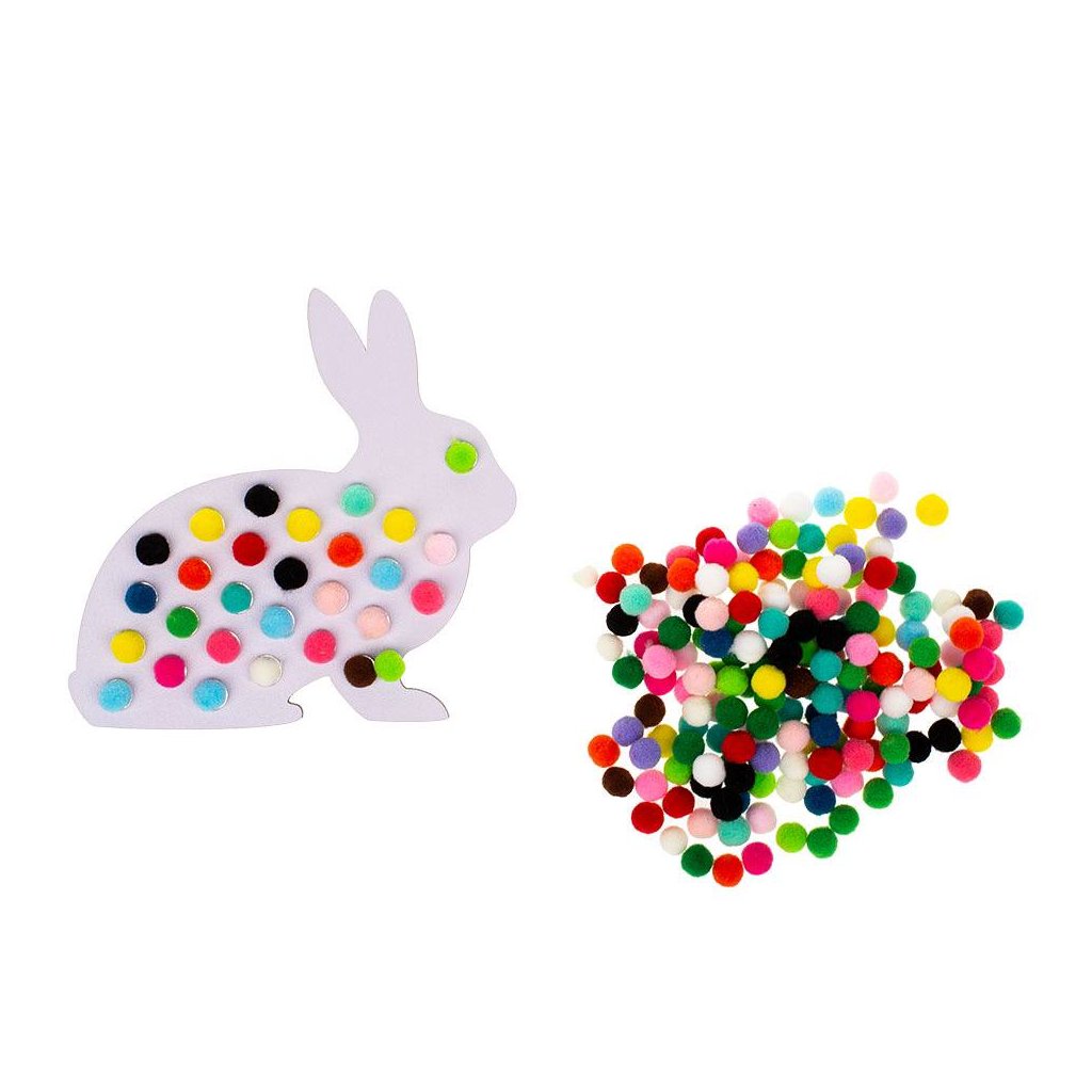 Obsahuje: 6 ks destiček-zajíčci různých barev, cca 200 ks barevných bambulek