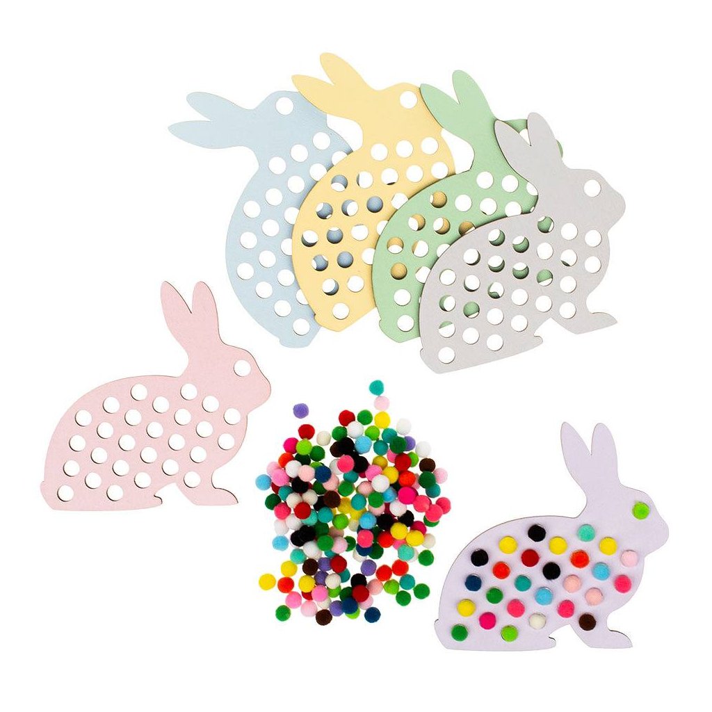 Velká sada 6 ks zajíčků v pastelových barvách s bambulkami (pomponky 1 cm, cca 200 ks). Velikost 12,5 cm. Vhodná sada i pro větší kolektivy. Víceúčelové destičky s otvory, které využijete na mnoho způsobů. Můžete do nich vkládat přiložené bambulky, provlékat ("vyšívat") tkaničkou, chlupatými drátky, použít jako šablonky, nebo i na různé prstíkové hry. Pomůcka na důležité trénování jemné motoriky předškolních dětí hravou formou, která se bude dětem líbit! Kvalitní bambulky příjemné na dotek, mix barev. Procvičí tvary, barvy, jemnou motoriku, koordinaci oko-ruka, podporuje soustředění... Bambulky využijete i k dalším krativním, či sensory aktivitám.