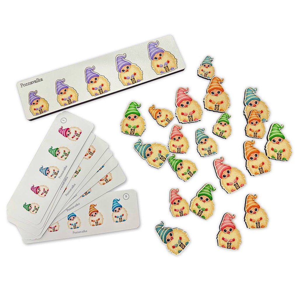 Obsahuje: 1 podložka, 25 dílků-skřítků (5 barev x 5 velikostí), 8 předloh na kartičkách