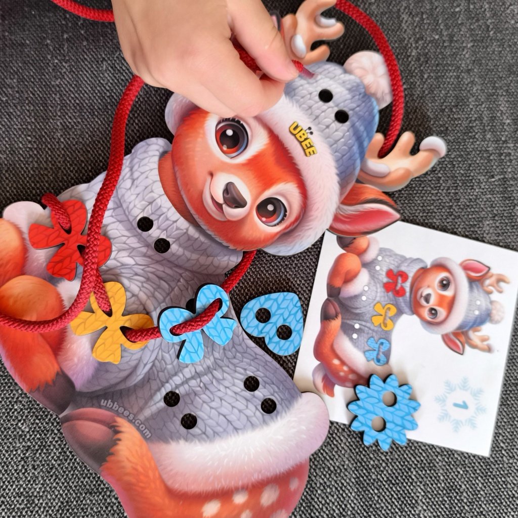 Parádní vánoční šněrovací hra s mnoha dílky a předlohami na kartičkách. Roztomilý srneček v zimním motivu udělá velkou radost! Součástí je 24 ozdob (3,5 cm) ve 3 barvách k navlékání, dlouhá tkanička, 20 zadání. Děti zábavnou formou cvičí motoriku prstíků, koordinaci oko-ruka, zrakové vnímání, soustředění... Můžete na destičku-srnečka našívat ozdoby dle předloh, dle fantazie, vyšívat ji tkaničkou. Dílky i jen navlékat na tkaničku, nebo je využít k dalšímu hraní a třídění (všechny motivy jsou ve třech barvách, možnost třeba logické tabulky se 2 vstupy: tvar+barva).