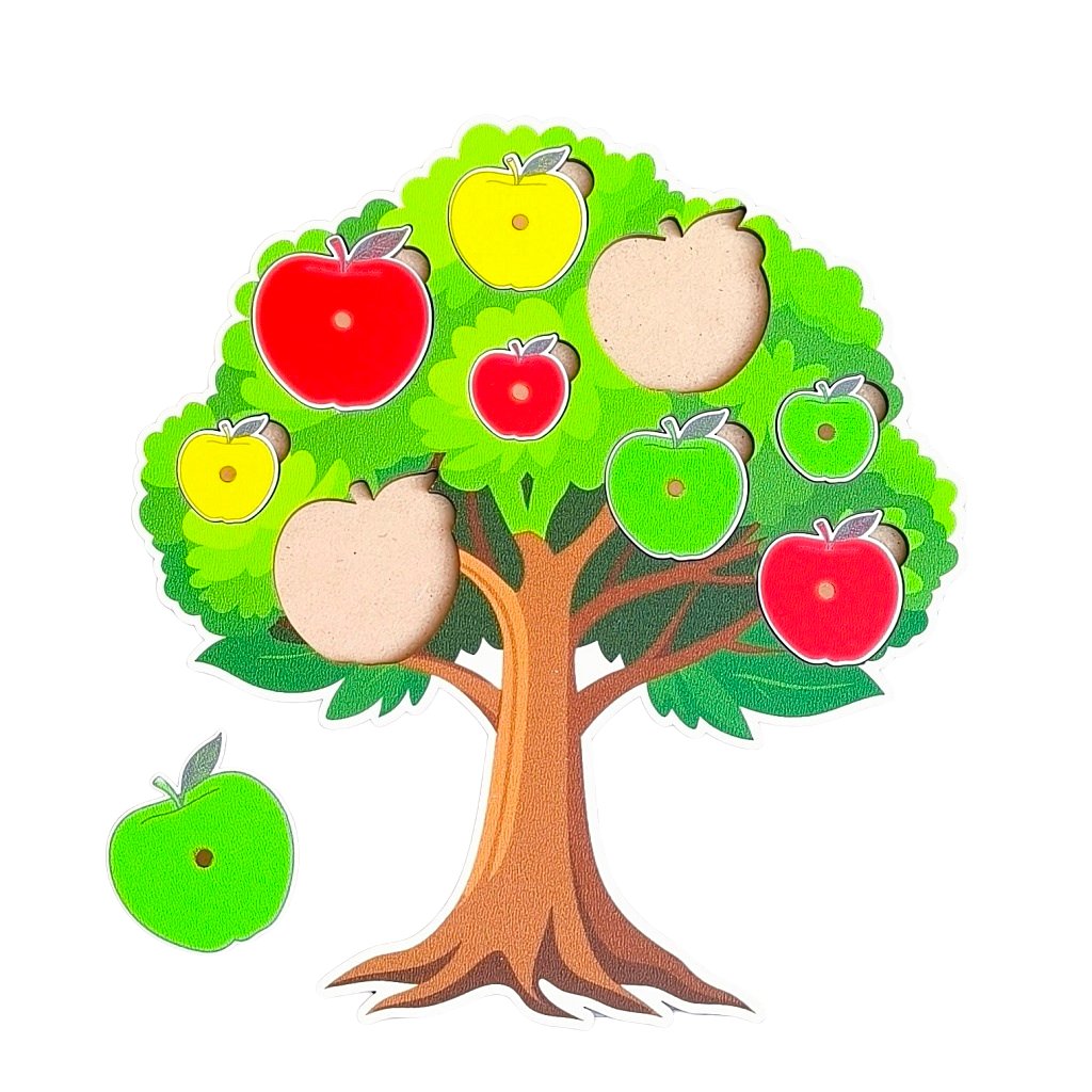 Obsahuje: 1 podložka-strom, 9 jablíček (3 barvy x 3 velikosti)