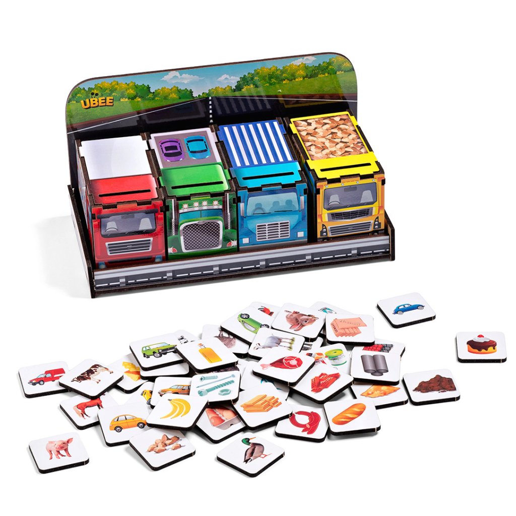 SNÍŽENÁ CENA Z DŮVODU NATRHNUTÉHO FOLIOVÉHO OBALU NA JEDNOM MÍSTĚ - ZBOŽÍ JE V POŘÁDKU! VYUŽIJTE MOŽNOSTI NAKOUPIT ZA VELMI VÝHODNOU CENU... Zcela originální sada, která potěší všechny malé kamioňáky! Stojan s vyjímacími 4 třídícími boxy ve tvaru nákladních aut a 40 dílků ke správnému zařazení (jedno auto převáží dopravní prostředky, druhé potraviny, třetí stavební materiál a čtvrté zvířata). Boxíky mají nahoře otvor pro vhazování dílků a jsou zezadu otvírací (může se tak náklad poté "vyložit-vysypat". Vhodné ke třídění, kategorizaci, povídání, rozvoji slovní zásoby, volnému hraní... Využít můžete i pro vlastní kartičky, dílky zase k hlubšímu povídání (co z toho dítě zná / vidělo, jí, má doma, jedlé-nejedlé, živé-neživé apod.). Procvičí jemnou motoriku, zrakové vnímání, koordinaci oko-ruka a chytře zabaví! Děti třídící boxíky milují :-)