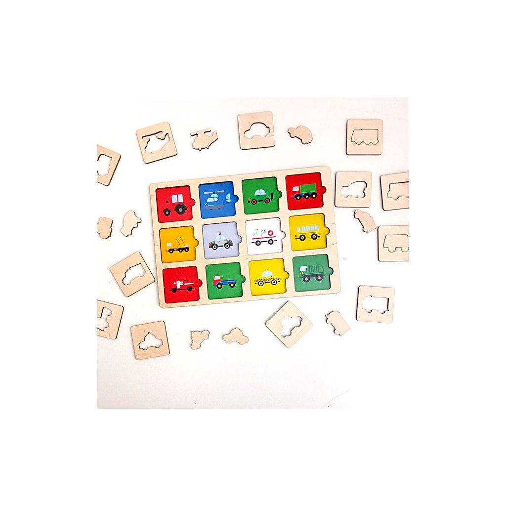 Zajímavá menší logická vkládačka s destičkami-šablonkami a výseky. Celkem 24 dílů. Vizuomotorická hračka, která zapojí jemnou motoriku, zrakové vnímání, dítě se musí soustředit na detaily výseků, správně je otočit... Skládat můžete do podložky s barevným pozadím dopravních prostředků - nejprve nalézt a správně přiřadit destičku se siluetou a pak vkládat správné výseky. Dílky využijete také při různých hrách mimo podložku (hmatové hry, najdi stín, šablonky, povídání o tématu...). Můžete si je i pomalovat (např. každý pár destička + výsek jednou barvou pro lehčí identifikaci, nebo domalovat obličejíky apod.). Dílky jsou menší, než naše Destičky Segena, čtverečky mají rozměr 4,2 cm, jedná se tedy o trošku složitější skládání s větším nárokem na motoriku prstíků a pozornost k detailu (cca od 3,5 roku). Zajímavá skládačka s veselým provedením, která dítě zabaví. Nabízíme ve vícero motivech.
