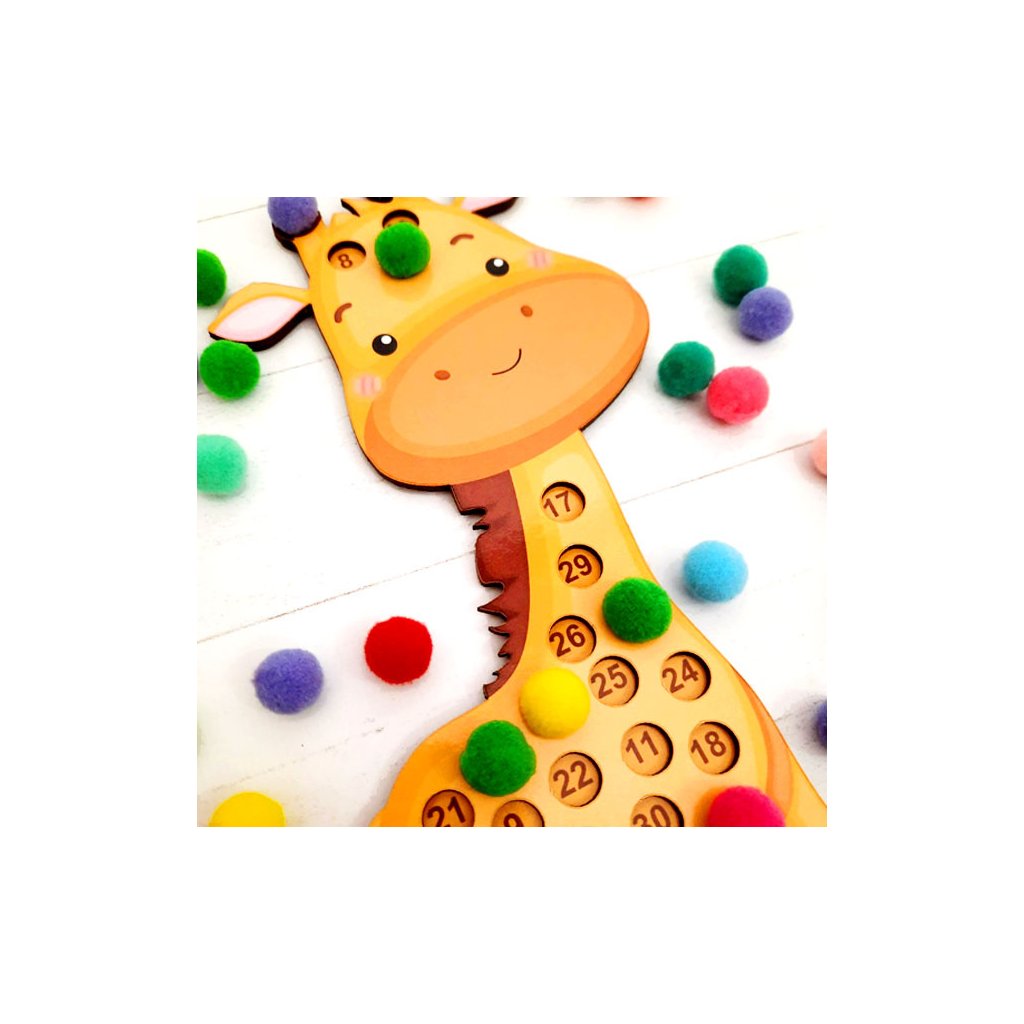 Pomůžete roztomilé žirafce vyzdobit kožísek? Nechte dítě počítat do třiceti a každé číslo na desce při jeho vyslovení nalézt a zakrýt bambulkou (nebo mohou jen použít své prstíky). Čísla jsou na žirafce zpřeházená, nutí tak dítě cíleně číslo vyhledávat a rozpoznat, procvičí zrakové vnímání. Spojení sluchového, zrakového a hmatového vjemu napomůže k lepší fixaci. Vhodné i jako pomůcka pro děti s poruchami učení. Můžete také zadávat sluchové povely (hledací hra) - např. "polož modrou bambulku na číslo 5". Roztomilé provedení, které se bude dětem líbit a nenásilnou formou procvičí i motoriku prstíků.