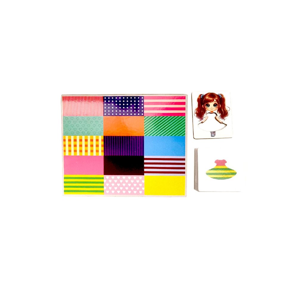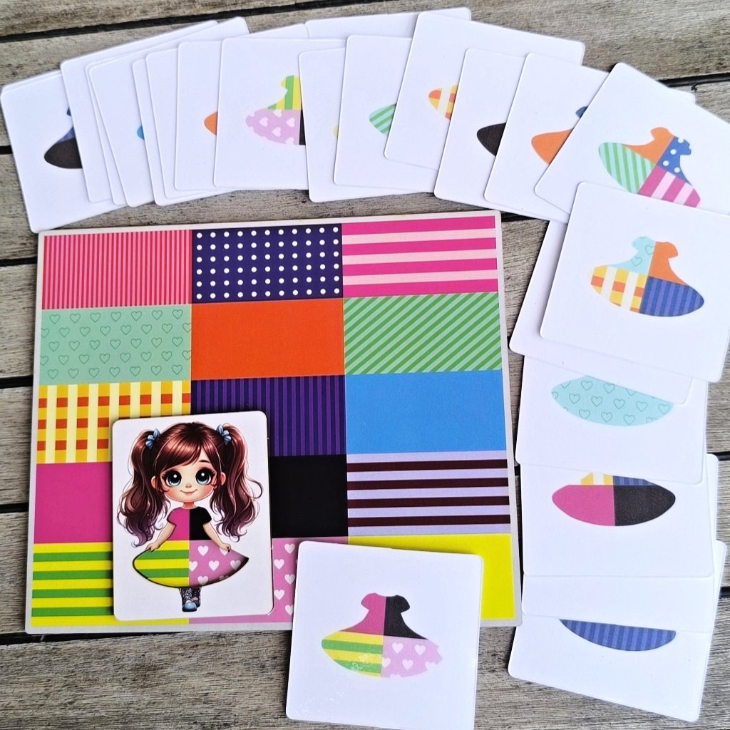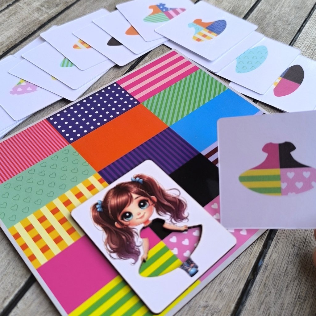 Najdete holčičce stejné šaty, jako na obrázku? Známá hra pro procvičení zrakového vnímání - hledání vzorů-fragmentů na desce, s motivem oblečení. Dítě hledá za pomoci okénka podle kartiček identickou část na podložce, musí jí také různě otáčet. Některé předlohy jsou těžší, některé lehčí. Jednoduchá hra, destička 18 cm, baleno v sáčku. V nabídce i verze s klukem.